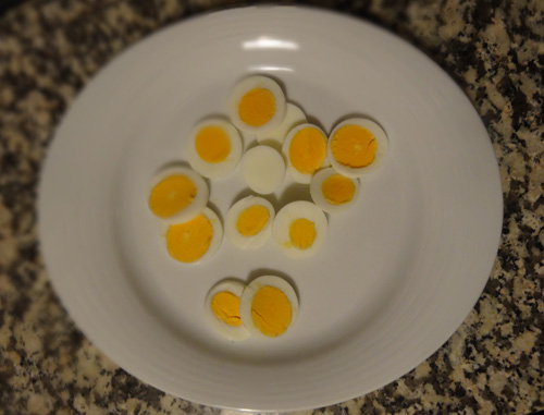 In the meantime, add 2 eggs to simmering water in a saucepan and let them cook for about 8 minutes. Peel them in cold running water and slice them (use an egg slicer for a prettier effect).