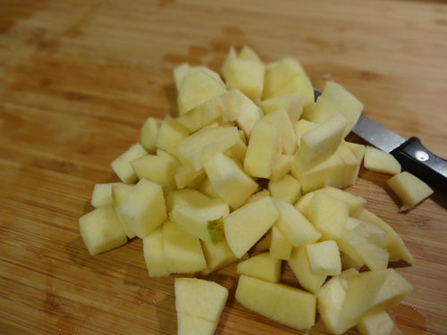Whisk 2 eggs and 125g of caster sugar. Add 2 dessert spoons of cinnamon and 1 dessert spoon of nutmeg. Slowly add 125g of softened butter and 125g of flour. Whisk. Cut 2 green apples in tiny pieces and add them to the bowl. Incorporate them into the mixture.