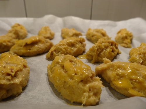 With the help of two spoons [or with your hands] make small oval biscuits and place them in an ovenproof dish over greaseproof paper. Brush them with egg yolk so they will get a seductive golden colour.