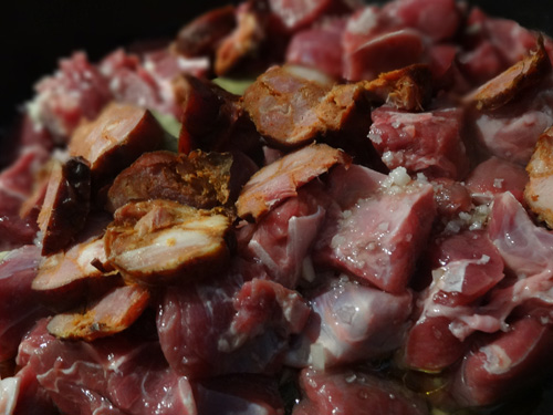 In a pan heat some olive oil, a chopped onion, 3 chopped garlic cloves, salt, 2 bay leaves and 2 chillies. Pour 140ml of white wine and heat. Add 500g of beef cut in cubes and a diced chorizo let it cook for about 15 minutes.