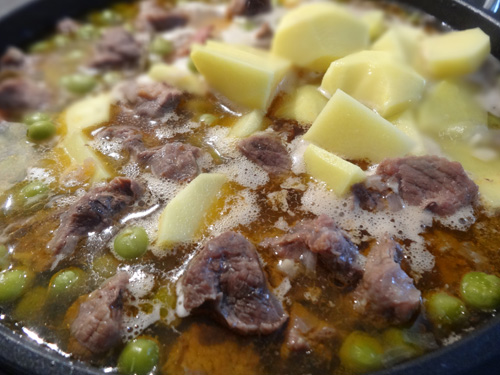 Adiciona 200g de ervilhas frescas. Deixa cozinhar durante cerca de 30 minutos e só então adiciona 3 batatas, aos cubos. Cozinha durante cerca de 20 minutos. Se reparares que está a ficar muito seco, adiciona água.
