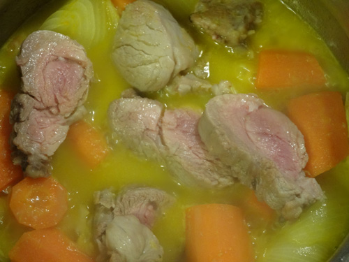 Loura 3 dentes de alho picados em azeite num tacho. Junta o lombinho e vai virando até alourar também. Deita o sumo de 3 laranjas, 3 cenouras em cubos e 1 cebola. Junta o equivalente ao sumo de laranja em água, fecha a tampa e deixa cozinhar durante cerca de 15 minutos.
