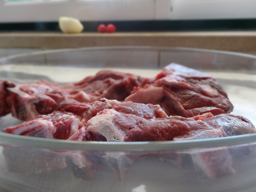 Then it was time to take care of the meat: two big pieces of veal chuck, cut in smaller pieces. I placed it all in an oven-proof dish.