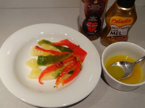 | This salad goes really well with pork ribs or with any meat in a tomato-based sauce (meatballs, for instance). Ingredients: 1 red bell pepper 1 green bell pepper 4 canned pineapple slices For the vinaigrette: 4 tablespoons olive oil 1 tablespoon PALADIN's fruit vinegar with passion fruit 1 tablespoon PALADIN's mustard with honey salt Grill the peppers over the stove for 15 to 20 minutes. Peel them, open them and take their seeds out. Cut them into strips. Reserve. Cut the pineapple slices into squares. Reserve. The vinaigrette is really simple to prepare: in a blender mix the olive oil, the vinegar, the mustard and the salt. The saucy blend of sweetness and acidity of the mustard with honey really compliments the surprising flavour of PALADIN'S fruit vinegar with passion fruit and the smoky flavour of the peppers over which you'll be pouring this vinaigrette. If you can't find mustard with honey near you, add just a slight portion of honey (I'd say about a coffee spoon) to your regular mustard. Place the pineapple squares and the peppers in a serving dish. Pour some of the vinaigrete over them. Serve the salad with the rest of the vinaigrette on the side. Don't be surprised if it doesn't take long to disappear. | Esta salada combina mesmo bem com entrecosto ou qualquer carne num molho à base de tomate (almôndegas, por exemplo). Ingredientes: 1 pimento vermelho 1 pimento verde 4 rodelas de ananás em lata Para o vinagrete: 4 colheres de sopa de azeite 1 colher de sopa de vinagre de fruta com polpa de maracujá PALADIN 1 colher de sopa de mostarda com mel PALADIN sal Grelhem os pimentos no fogão durante 15 a 20 minutos. Tirem-lhes a pele, abram-nos e tirem-lhes as sementes. Cortem-nos em tiras. Reservem-nos. Cortem as rodelas de ananás em quadrados. Reservem-nos. O vinagrete é muito simples de preparar: misturem o azeite, o vinagre, a mostarda e o sal. A mistura atrevida de doçura e acidez da mostarda com mel complementa mesmo bem o sabor surpreendente do vinagre de fruta com maracujá da PALADIN e o sabor fumado dos pimentos sobre os quais irão colocar este vinagrete. Se não conseguirem encontrar mostarda com mel perto de vocês, adicionem uma pequena porção de mel (diria cerca de uma colher de café) à vossa mostarda habitual. Coloquem os quadrados de ananás e os pimentos num prato de servir. Deitem um pouco do vinagrete por cima. Sirvam a salada com o resto do vinagrete ao lado. Não se admirem se não demorar muito a desaparecer. |