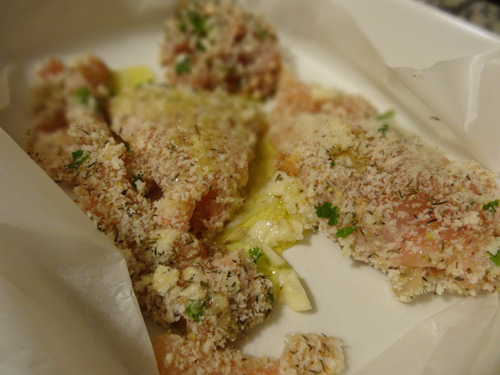 Numa taça, junta tomilho e salsa picados e uma pitada de oregãos secos (eventualmente, a escolha quanto às ervas a usar é tua, mas recomendo mesmo esta combinação) a pão ralado.