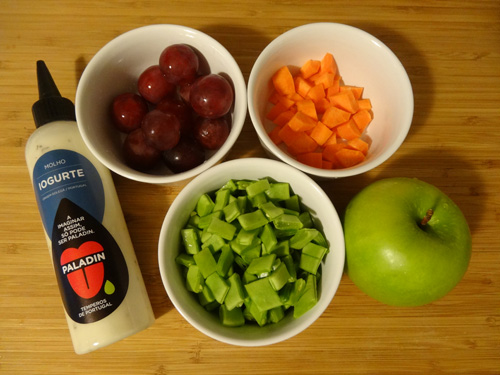 Ingredientes 1 maçã 10 uvas 10 vagens de feijão verde 1 cenoura Vinagre de fruta com aroma a maçã verde Paladin Molho de Iogurte Paladin Sal |