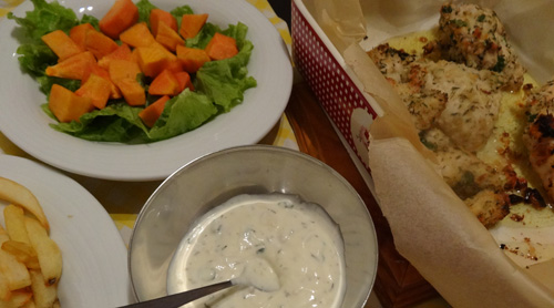 I served the chicken with french fries and a lettuce and persimmon salad (I only used a pinch of sea salt to season it, since I expected the yogurt sauce to do all that hard work).