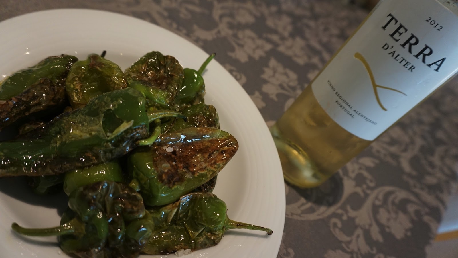 | Obviously inspired by one of my favourite starters at one of my favourite restaurants at the moment - Jácome, in Leça da Palmeira -, today I offer you these beautiful Padrón: Ingredients: Padrón peppers sea salt 2 tablespoons of olive oil a few drops of lemon juice Heat the olive oil in a skillet and place the padrón peppers. Cook them until they char. Then toss them and let them cook until they are tender. Take them off the heat. Add the lemon juice and toss them again. Place the padrón peppers in a serving bowl and sprinkle them with the salt. Serve them with a chilled glass of white wine. This time I had Terras d'Alter 2012, which matches the taste of the charred peppers perfectly. Enjoy! | Obviamente inspirada por uma das minhas entradas preferidas num dos meus restaurantes do momento - o Jácome, em Leça da Palmeira -, hoje ofereço-vos estes belos Padrón: Ingredientes: pimentos Padrón sal grosso 2 colheres de azeite de azeite algumas gotas de sumo de limão Aqueçam o azeite numa frigideira e coloquem os pimentos padrón. Cozinhem-nos até estarem chamuscados. Mexam-nos e deixem que cozinhem até estarem tenros. Tirem-nos do lume. Espremam o sumo de limão e agitem-nos outra vez. Coloquem os pimentos padrón numa taça e salpiquem-nos com o sal. Sirvam-nos com um copo gelado de vinho branco. Desta vez provei Terras d'Alter 2012, que combina na perfeição com o sabor grelhado dos pimentos. Bom apetite! |